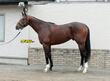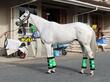 それにしても、のんびりしている。おとなしいんですね-。そう声を掛けると、「いや、ゼッケンを乗せようとすると、前へ行ったり、後ろに行ったりでね」と山田さん。ゼッケンと鞍の装着準備を始めただけで、急にソワソワするファントムシーフ。うわ、ホンマや。言っていた通り。ゼッケンを持っているだけで体を前後します。もうルーティンなんですね。